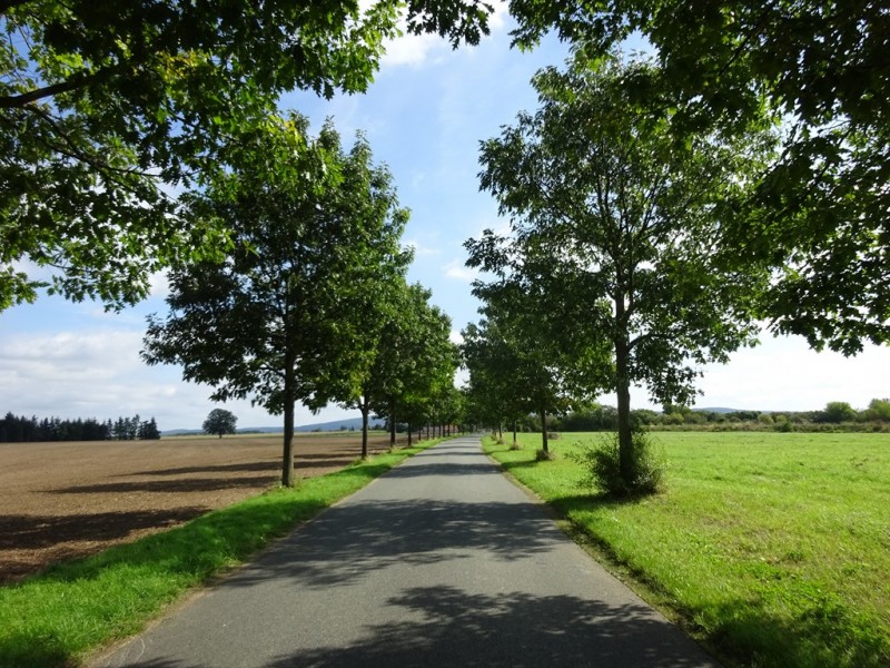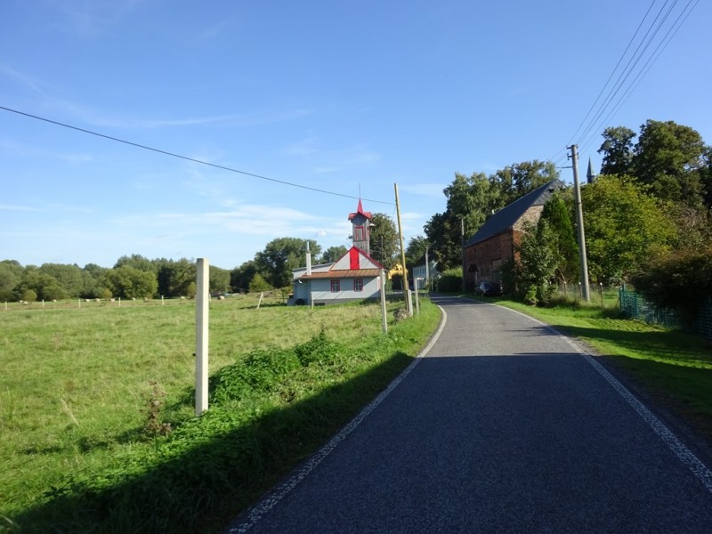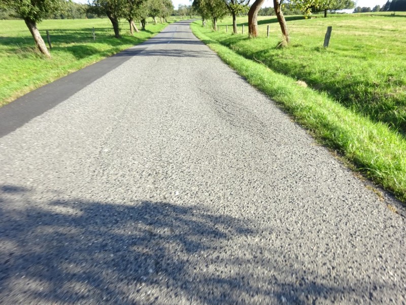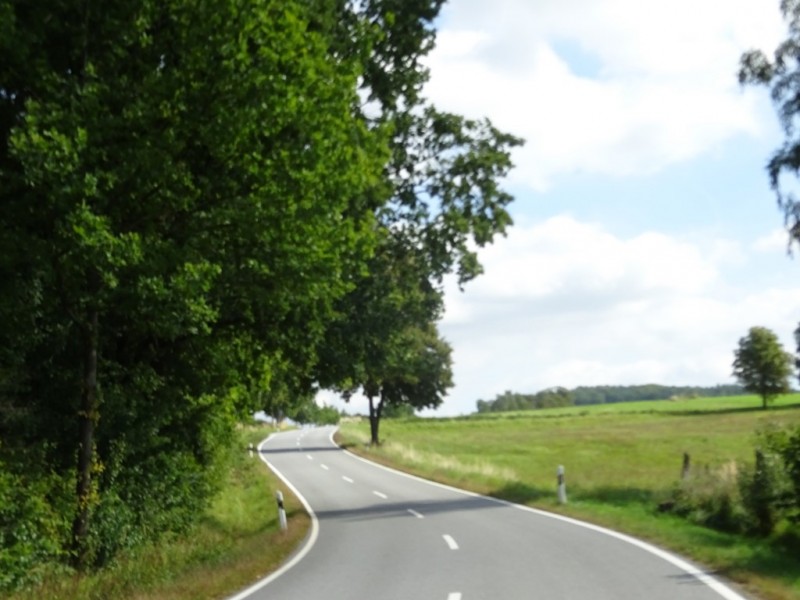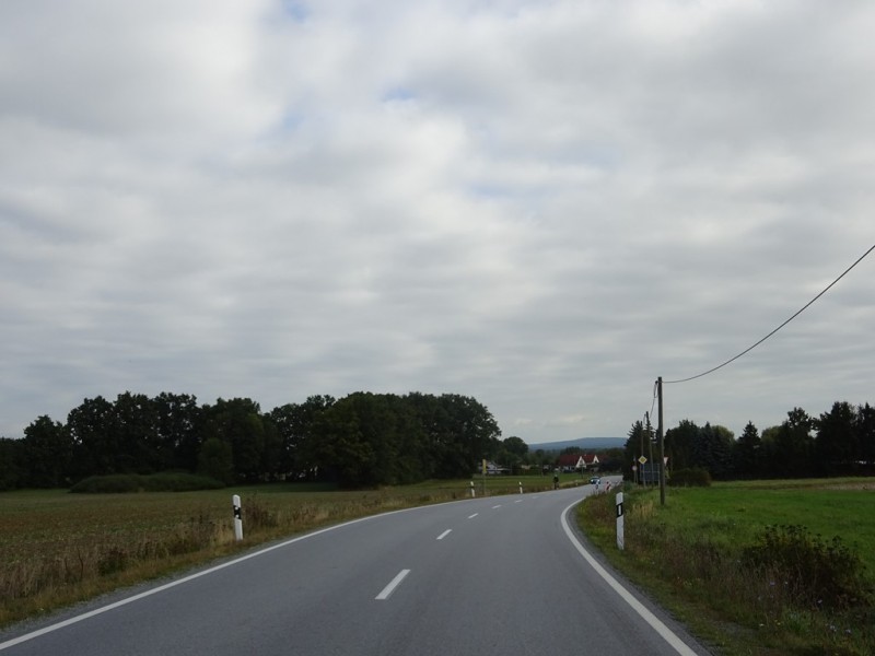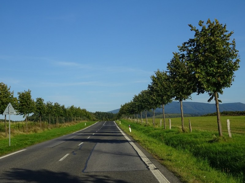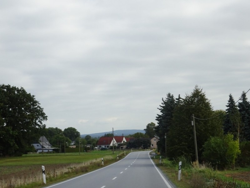 Trabusia podziwiam szukając objazdu do zagrodzonego na amen skrętu w lewo do potrzebnej mi drogi na Weißenberg. Objazdu nijak nie widać, skrzyżowanie rozryte do spodu, nie wygląda to dobrze… Ale przyuważam rowerowego lokalsa znikającego gdzieś pomiędzy domami, ruszam za nim i jest tam ukryta droga, idealnie za ten rozryty kawałek wyprowadzająca. Yes!